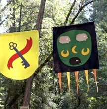Each year we pull together a team of people to transform Pioneer Park into a Renaissance wonderland. One of these tasks involves stringing colorful felt banners from the treetops to add a splash of color to the festivities. A local quilting group called Friends to Dye For has been adding to our collection of banners with their artistic works of art. Thank you Sandra Bruce and Friends!